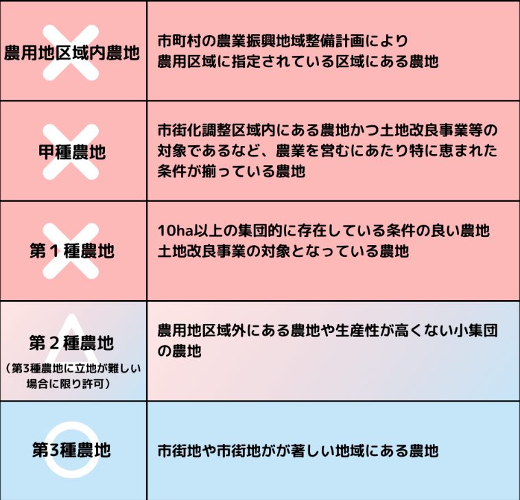 しかし、その農地が第一種農地、甲種農地、農用地区域内農地だった場合、建築できない可能性があります。許可がとれるのかどうか確認をしておきましょう。
