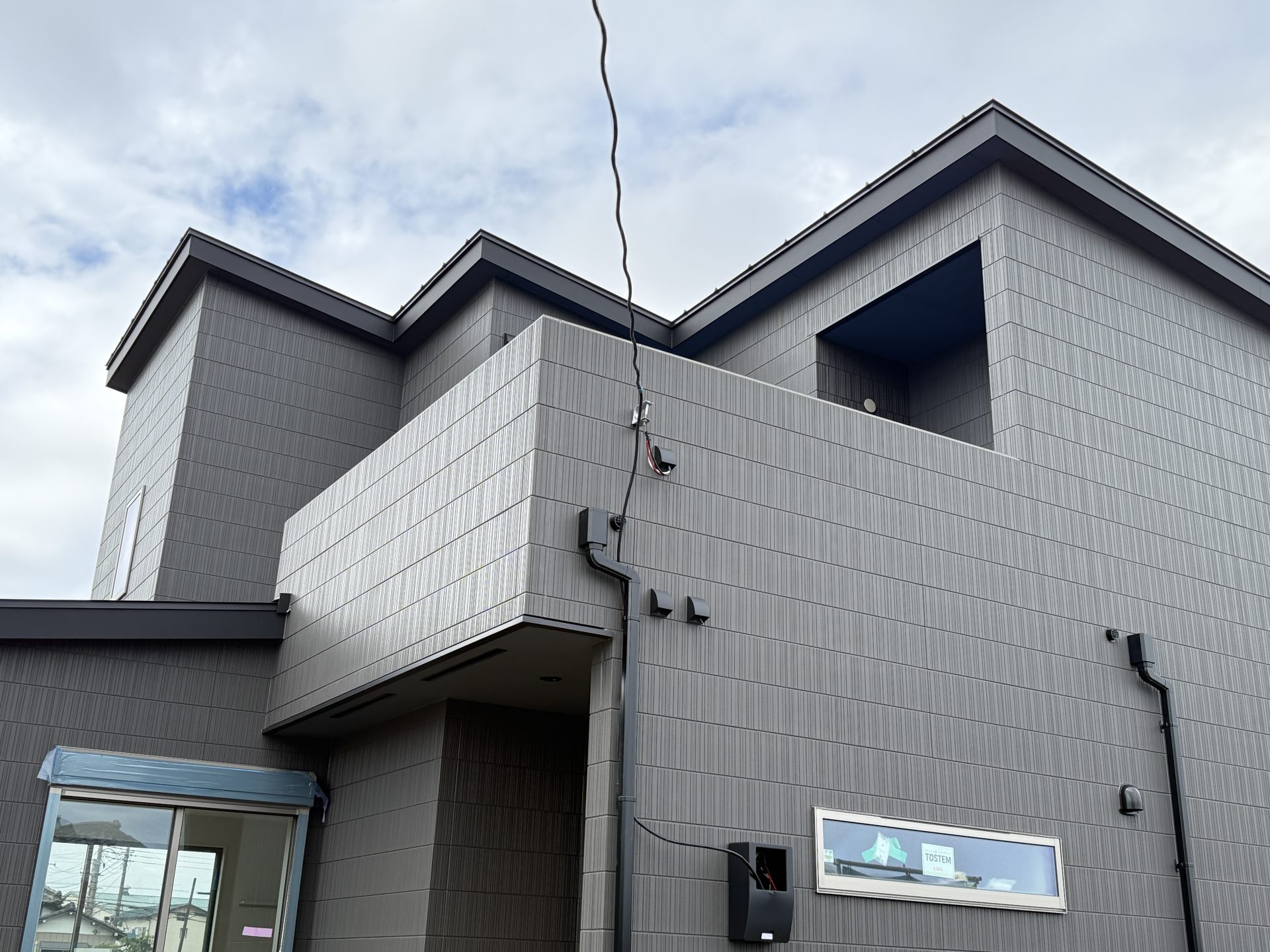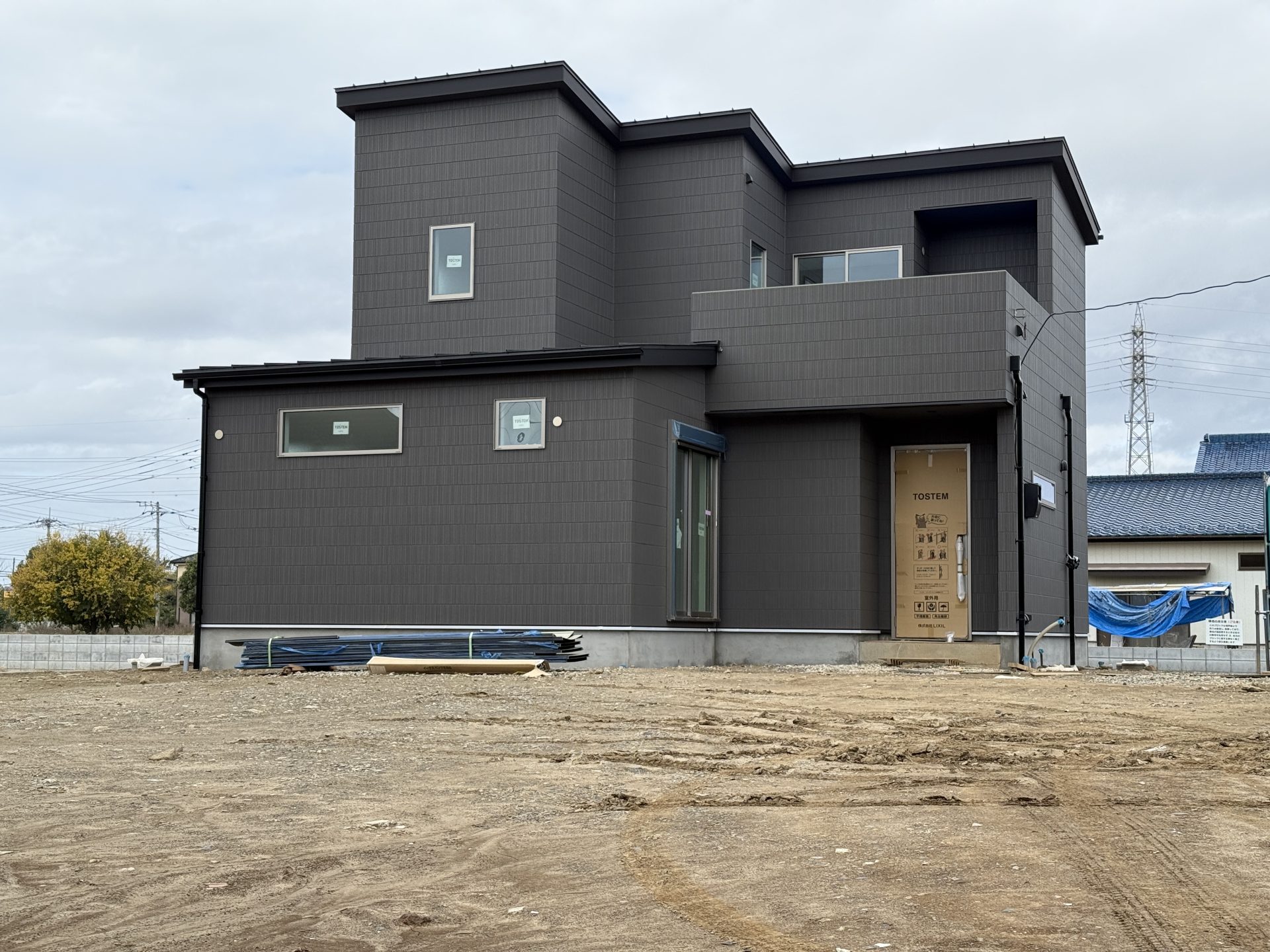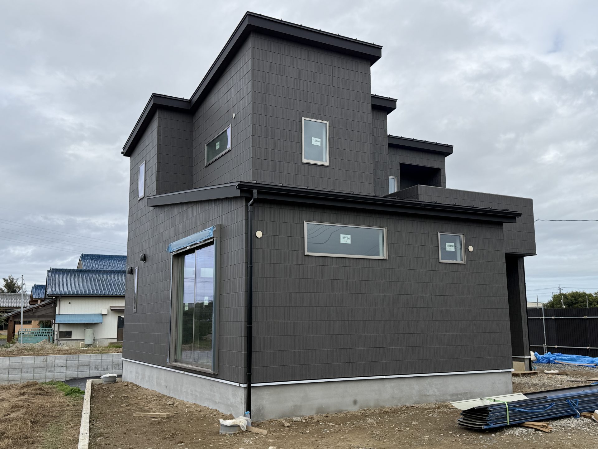越谷市増林に建築中のA様邸は、ついに足場が解かれ、外観のお披露目となりました。広々とした土地に黒く引き締まった躯体が屹立する様子は感慨深いものがあります。