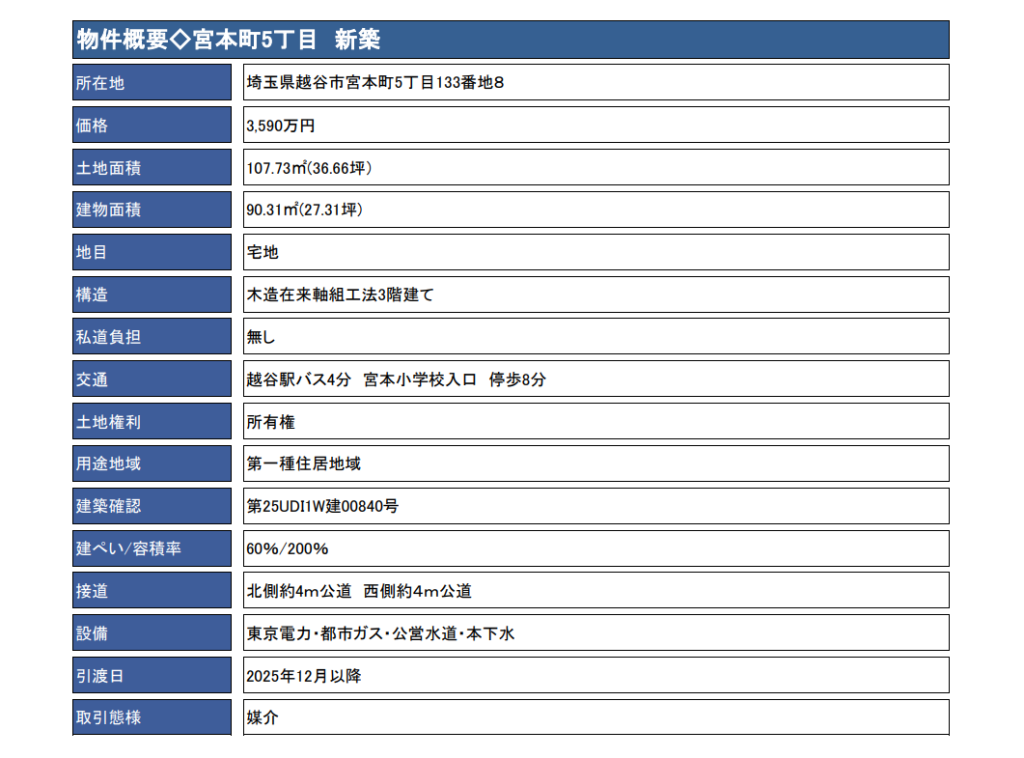 | 3590万円 | 埼玉県越谷市宮本町5丁目133番地8 | 107.73㎡ | 90.31㎡ | 4LDK+ガレージ+屋上庭園 |