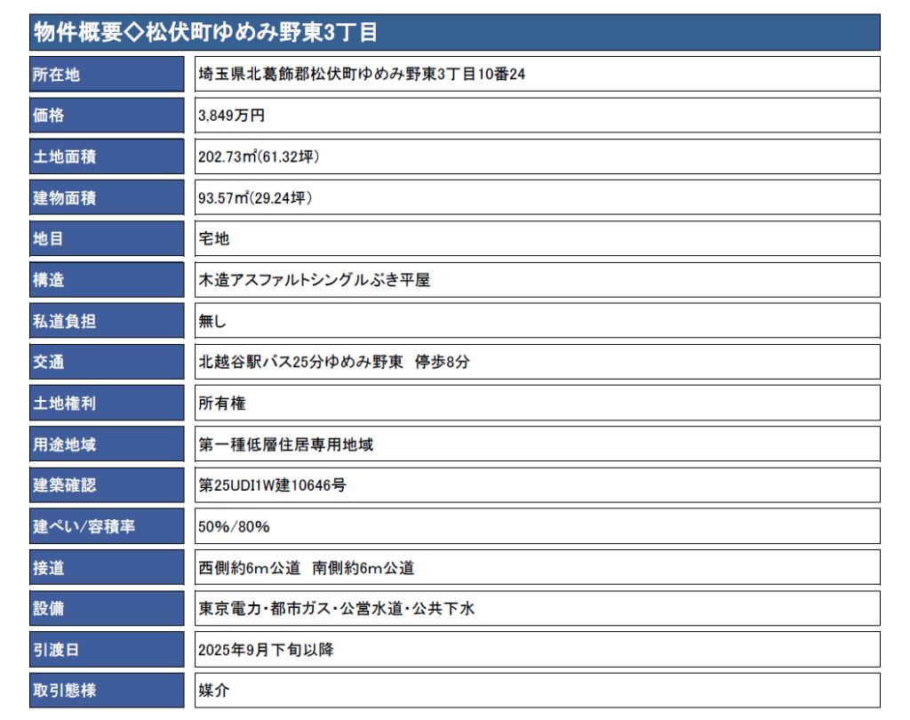 | 3,849万円 | 埼玉県北葛飾郡松伏町ゆめみ野東3丁目10番24 | 202.73㎡(61.32坪) | 93.57㎡(29.30坪) | 3LDK |