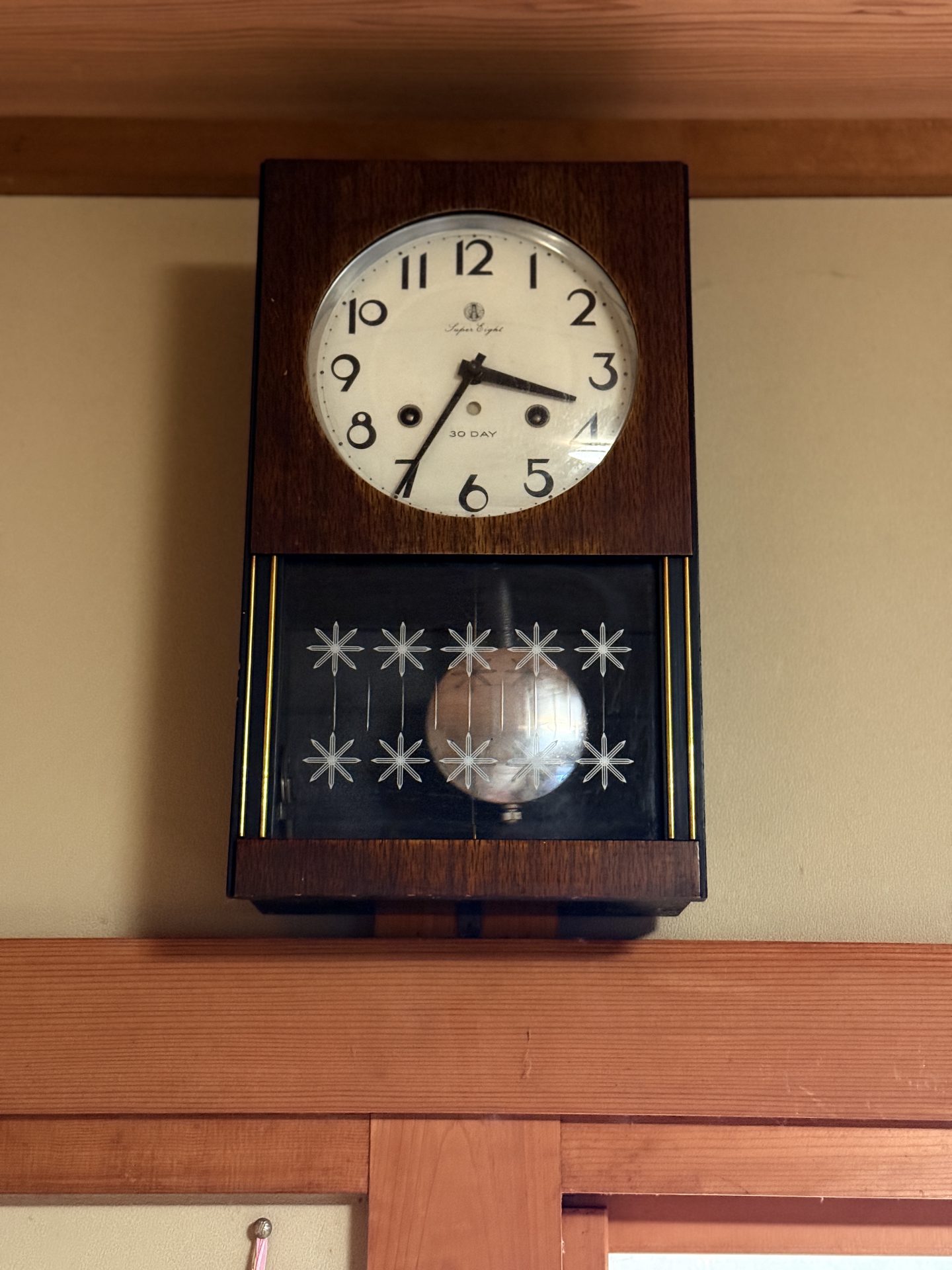 きょう、わが家の和室に古い振り子時計を設置しました。おそらく昭和30年代の愛知時計の製品です。同じような時計が田舎の本家にもありましたので、当時としてはありふれた時計だったのでしょう。本家の時計は、1週間に一度はゼンマイのネジを巻いていたと記憶しています。こちらの時計はいちどゼンマイをまくと30日は動作し続けるという改良版「スーパーエイト」です。いつの間にか、打刻が30分ずれるようになっていましたが、これをようやく正しく直すことができたので、壁への設置となりました。