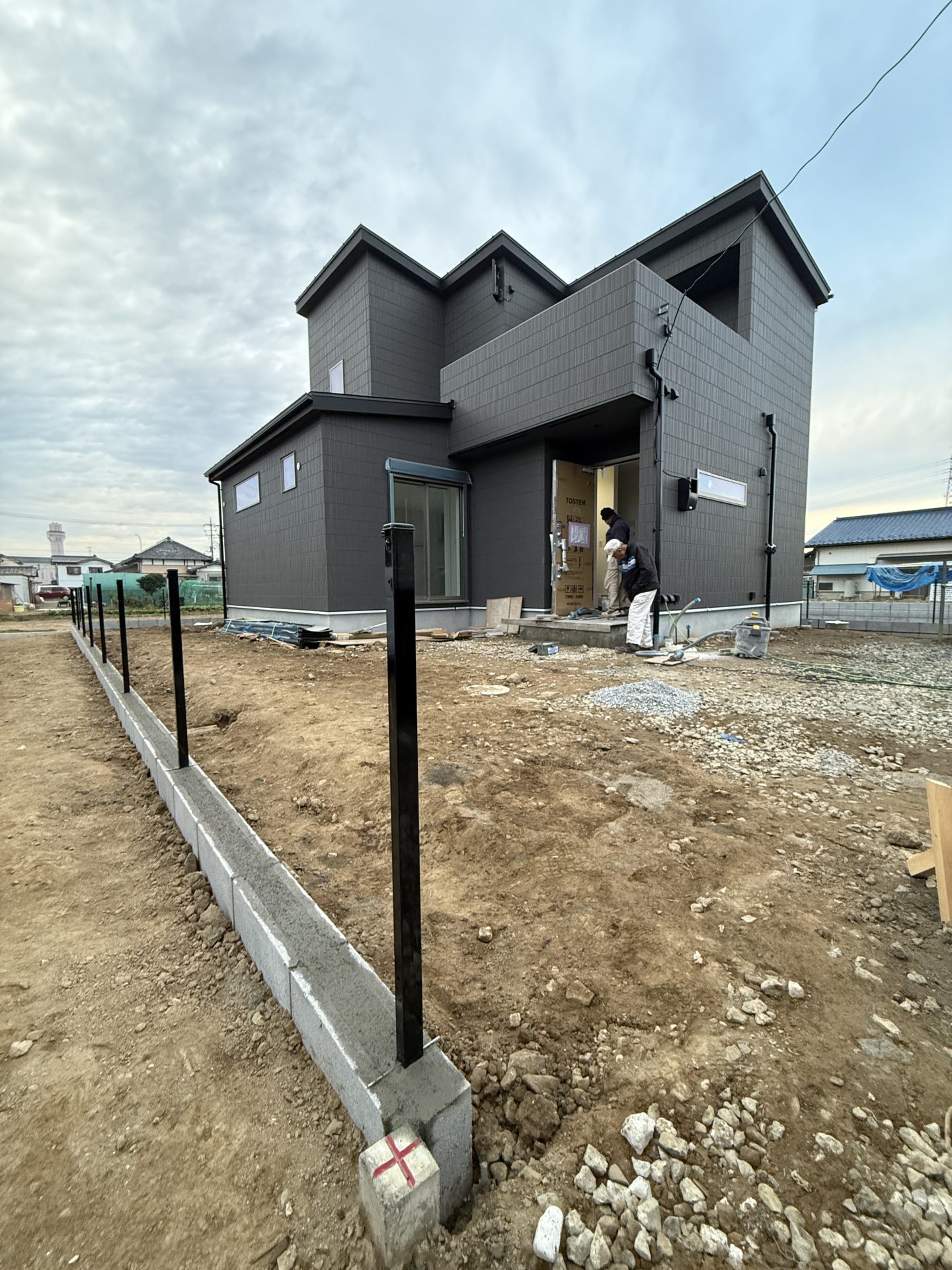 越谷市増林に建築中のA様邸は、ついに足場が解かれ、外観のお披露目となりました。広々とした土地に黒く引き締まった躯体が屹立する様子は感慨深いものがあります。