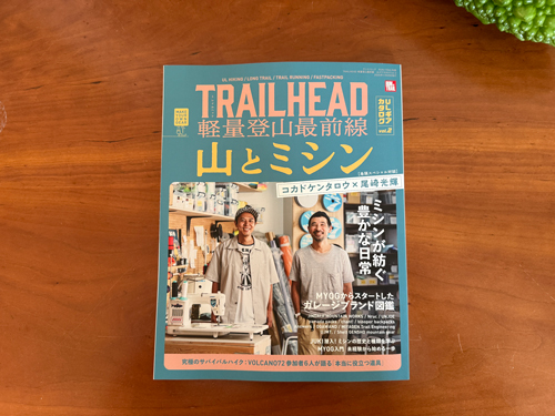 さて、先の休みに時間潰しに入った本屋で雑誌コーナーを眺めていると、え、どういうこと? と思わず声が出るようなタイトル文字が目に入りました。そこには「山とミシン」と書かれていました。雑誌の名前は「TRAILHEAD」、どうやら山道を走る人たちが読む雑誌「RUN+TRAIL」の別冊のようです。軽量登山やロングトレールを趣味にする人たち向けのムックなのですね。