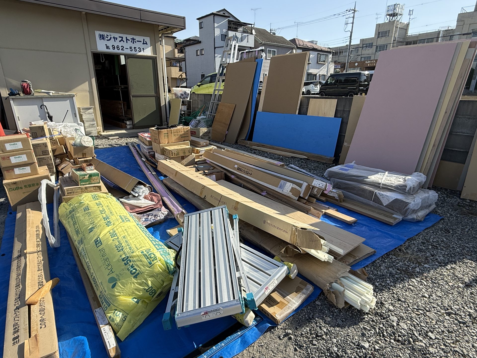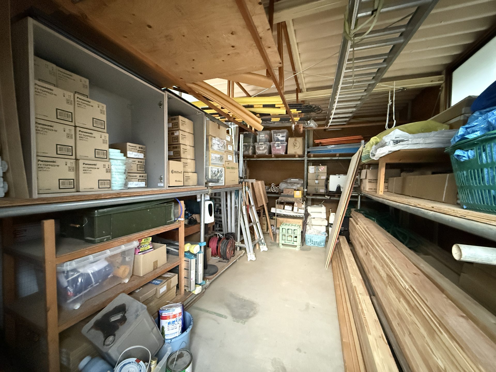 ジャストホームの駐車場の脇にある倉庫には、看板やのぼり旗のような販促グッズだけでなく、はしごやスコップ、ホースリールなど現場の作業に欠かせない道具、そして合板や垂木、ビスなど各種残材が大量に収納されています。現場の工事が進むにつれ、なぜか倉庫の荷物は少しずつ増えていくのです。ただ、荷物が増えすぎると、どこに何がいくつあるのか分からなくなってしまうので、年末に整理をします。今年はいつもより徹底的に片づけました。